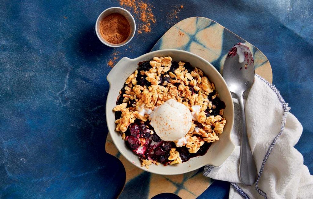 Enjoy this slightly decadent, but healthy-ish, dessert for one. It can also be made gluten and nut-free. Add blueberries and toss to coat. Add lemon juice and toss to coat.